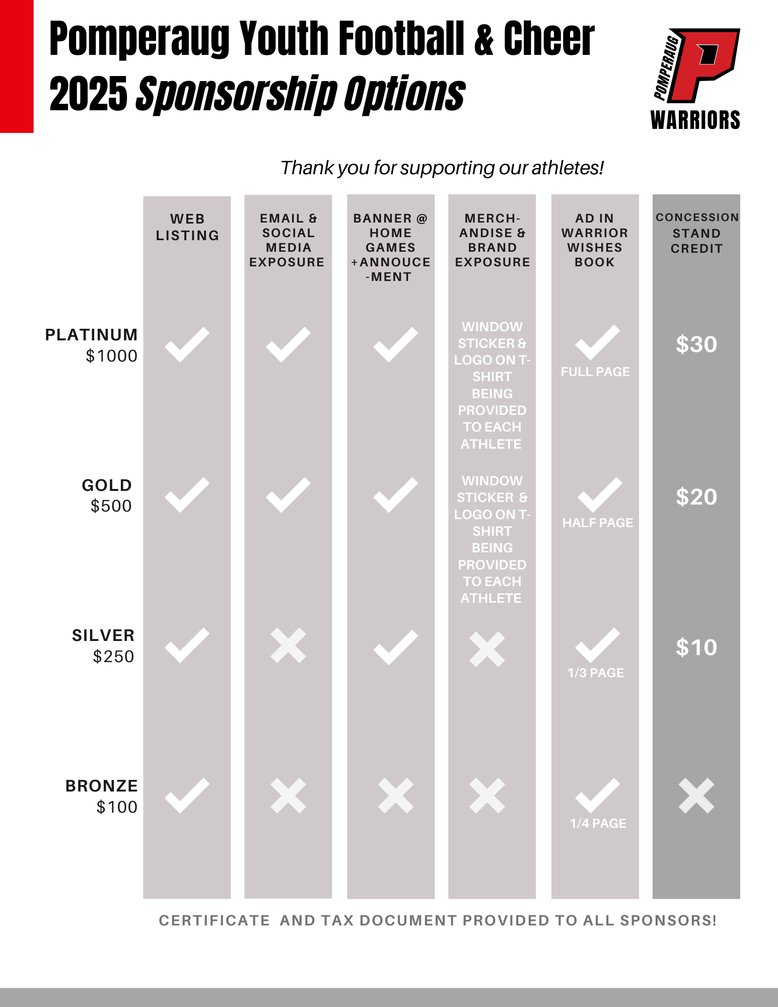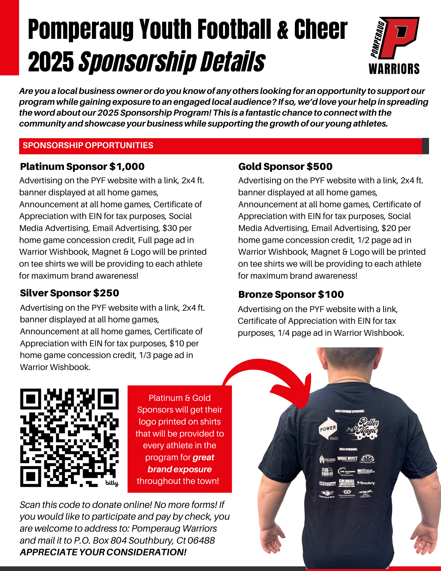Your sponsorship helps us provide high-quality equipment, field time, uniforms, safety gear, and unforgettable experiences for our players and cheerleaders. It also gives your business visibility among hundreds of local families and community members who value those who invest in our youth.